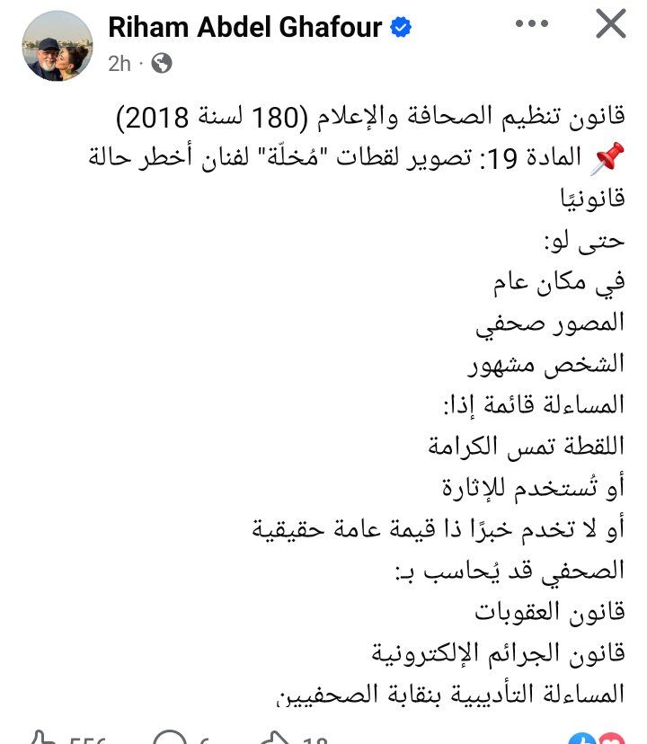 وكتبت ريهام عبد الغفور في منشور رصده موقع تحيا مصر عبر حسابها الرسمي بموقع التواصل الاجتماعي فيسبوك: "قانون تنظيم الصحافة والإعلام (180 لسنة 2018) المادة 19: تصوير لقطات "مُخلّة" لفنان أخطر حالة قانونيًا حتى لو: في مكان عام المصور صحفي الشخص مشهور المساءلة قائمة إذا: اللقطة تمس الكرامة أو تُستخدم للإثارة أو لا تخدم خبرًا ذا قيمة عامة حقيقية الصحفي قد يُحاسب بـ: قانون العقوبات قانون الجرائم الإلكترونية المساءلة التأديبية بنقابة الصحفيين".