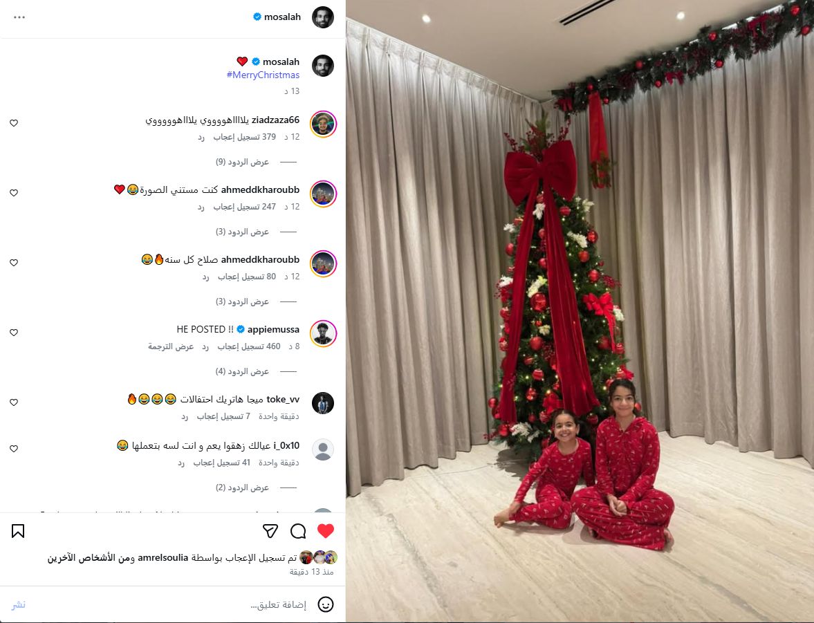 تحيا مصر، قد أثار هذا المنشور، الذي أصبح تقليداً سنوياً بالنسبة له، ردود فعل متباينة بين مؤيد ومعارض بين متابعيه، وظهرت أبناء محمد صلاح، مكة وكيان، وهما ترتديان ملابس بيجامات"، متطابقة بنقشة الكاروهات الحمراء، أمام شجرة عيد ميلاد مضاءة ورجل خبز الزنجبيل كبير الحجم.