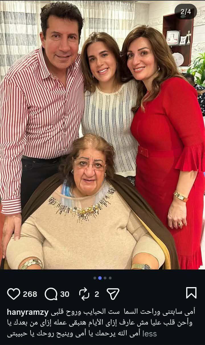 وكتب هاني رمزي في رسالته التي رصدها موقع تحيا مصر على حسابه الرسمي بموقع تبادل الصور والفيديوهات انستجرام: "أمي سابتني وراحت السما، ست الحبايب وروح قلبي، أحن قلب عليا، مش عارف الأيام هتبقى عاملة ازاي من بعدك يا أمي، الله يرحمك يا أمي ويريح روحك يا حبيبتي".