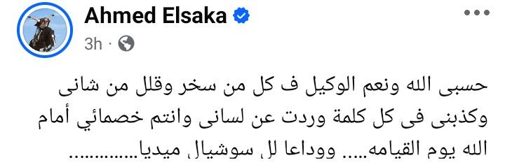 وقال أحمد السقا في منشور رصده موقع تحيا مصر على حسابه الرسمي بموقع التواصل الاجتماعي فيسبوك: حسبي الله ونعم الوكيل في كل من سخر وقلل من شأني وكذبني فى كل كلمة وردت عن لسانى وانتم خصمائي أمام الله يوم القيامة.. ووداعا للسوشيال ميديا.