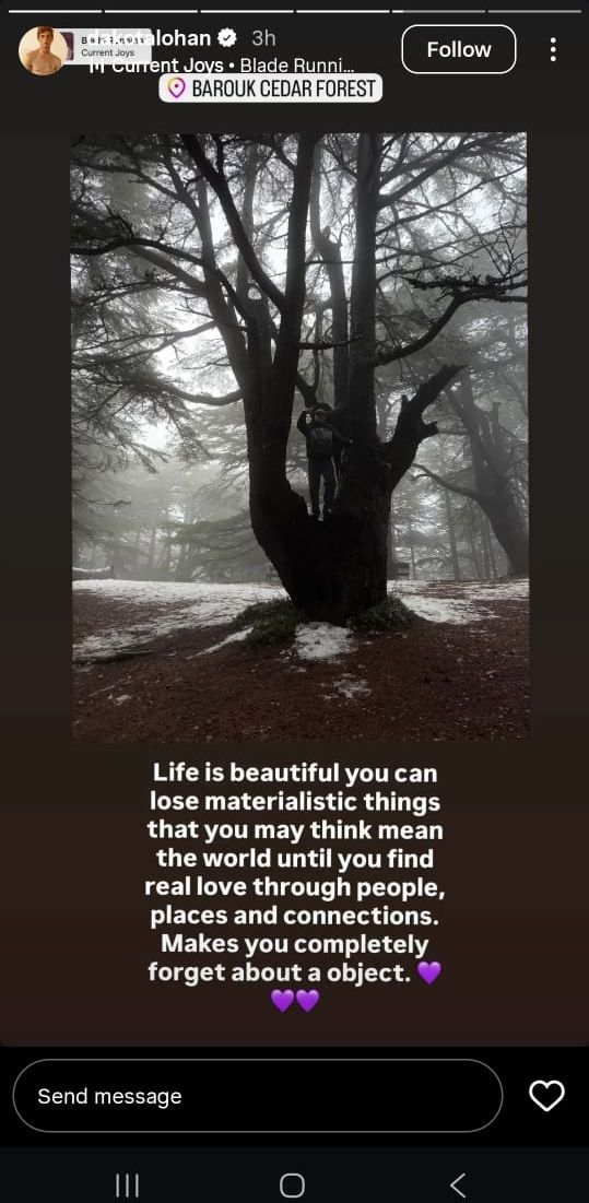 ووثقت ليندسي من خلال فيديو نشرته عبر خاصية "ستوري" عبر حسابها على "انستغرام"، جولتها في لبنان، في منطقة جبليّة.