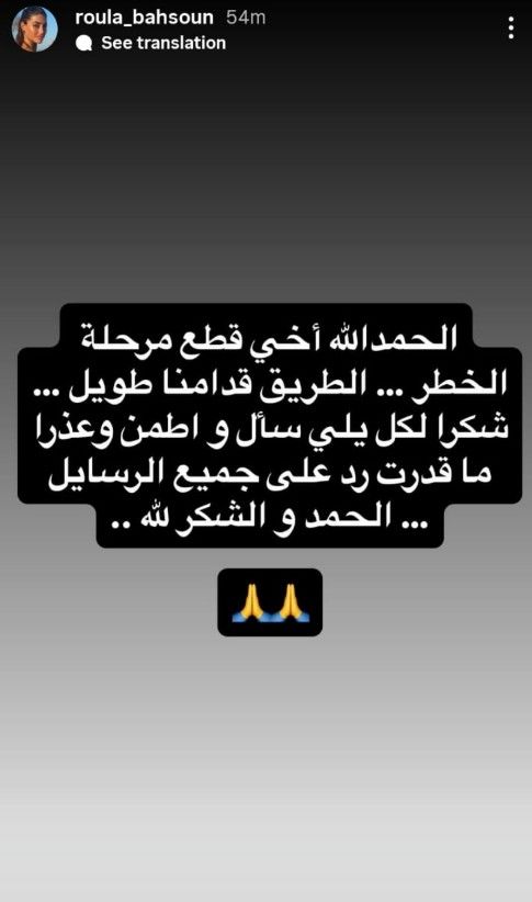 وكتبت رولا قائلة: "الحمدالله أخي قطع مرحلة الخطر.. الطريق قدامنا طويل.. شكرا لكل يلي سأل واطمن وعذرا ما قدرت رد على كل الرسايل.. الحمد والشكر لله".