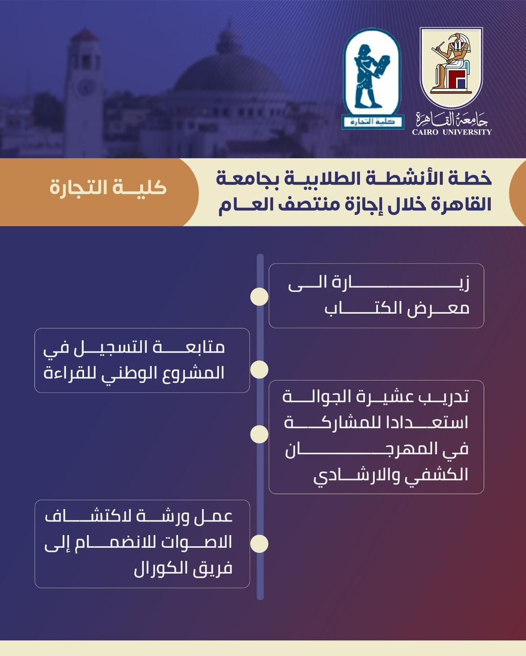 أعلنت جامعة القاهرة عن جداول الأنشطة الطلابية التي ستنظمها كليات الجامعة خلال إجازة منتصف العام الدراسي 2025 - 2026، وذلك بهدف توفير فرص متعددة للطلاب للمشاركة في مختلف الفعاليات الثقافية والفنية والعلمية والرياضية والاجتماعية، بما يساعدهم على استثمار إجازتهم في تطوير مهاراتهم واكتشاف مواهبهم.