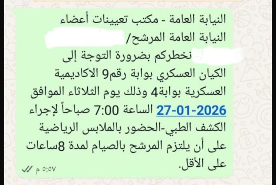 وفي هذا السياق، استعرض الباز عبر صفحته على موقع "فيسبوك"، مستندًا رسميًا صادرًا عن مكتب تعيينات أعضاء النيابة العامة التابع للنائب العام، يفيد بإخطار بعض المرشحين بالتوجه إلى الأكاديمية العسكرية بوابة رقم 9 لإجراء الكشف الطبي فقط، وفق الإجراءات المعتادة، مع الالتزام بالحضور بالملابس الرياضية والصيام لمدة لا تقل عن 8 ساعات.