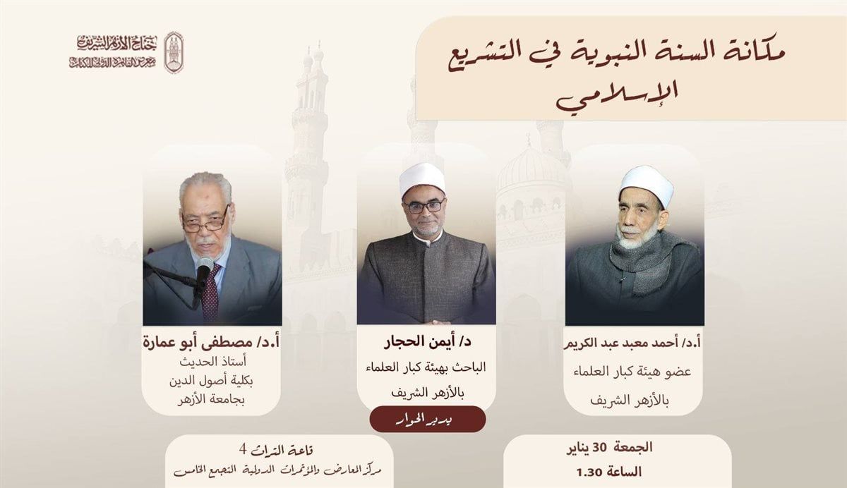 ينظم جناح الأزهر الشريف بمعرض القاهرة الدولي للكتاب، في دورته السابعة والخمسين، يوم غد الجمعة ندوتين، في إطار في إطار مناقشة مكانة السنة النبوية في التشريع الإسلامي والعدالة التاريخية للصحابة ونشر الفكر الإسلامي الوسطي.