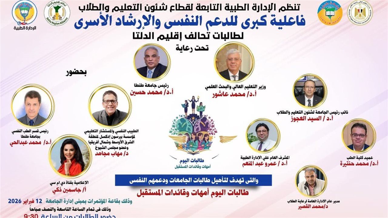 تشهد الفاعلية حضور الدكتور مهاب مجاهد الطبيب النفسي والمستشار التعليمي لمؤسسة بيرسون ادكسل لمنطقة الشرق الأوسط وشمال افريقيا وعضو مجلس الشيوخ، الدكتور محمد عبد الحى رئيس قسم الطب النفسي بكلية الطب جامعة طنطا، وتناقش الفاعلية أهم محاور الدعم النفسي والإرشاد الأسري من واقع ملفات الإدارة الطبية وتشمل الفهم العلمي للطاقة الأنثوية وكاريزمة الطالبات والسيدات، المؤثرات العائلية في تكوين وإدراك الطالبات، التغلب علي الاساءات المجتمعية نحو المرأة، ومعايير اختيار شريك الحياة في ظل التحديات المعاصرة، والتوازن بين الأمومة والنجاحات العملية،بقاعة المؤتمرات بمبنى إدارة الجامعة يوم الخميس، الموافق 12 فبراير، الساعة التاسعة والنصف صباحا.