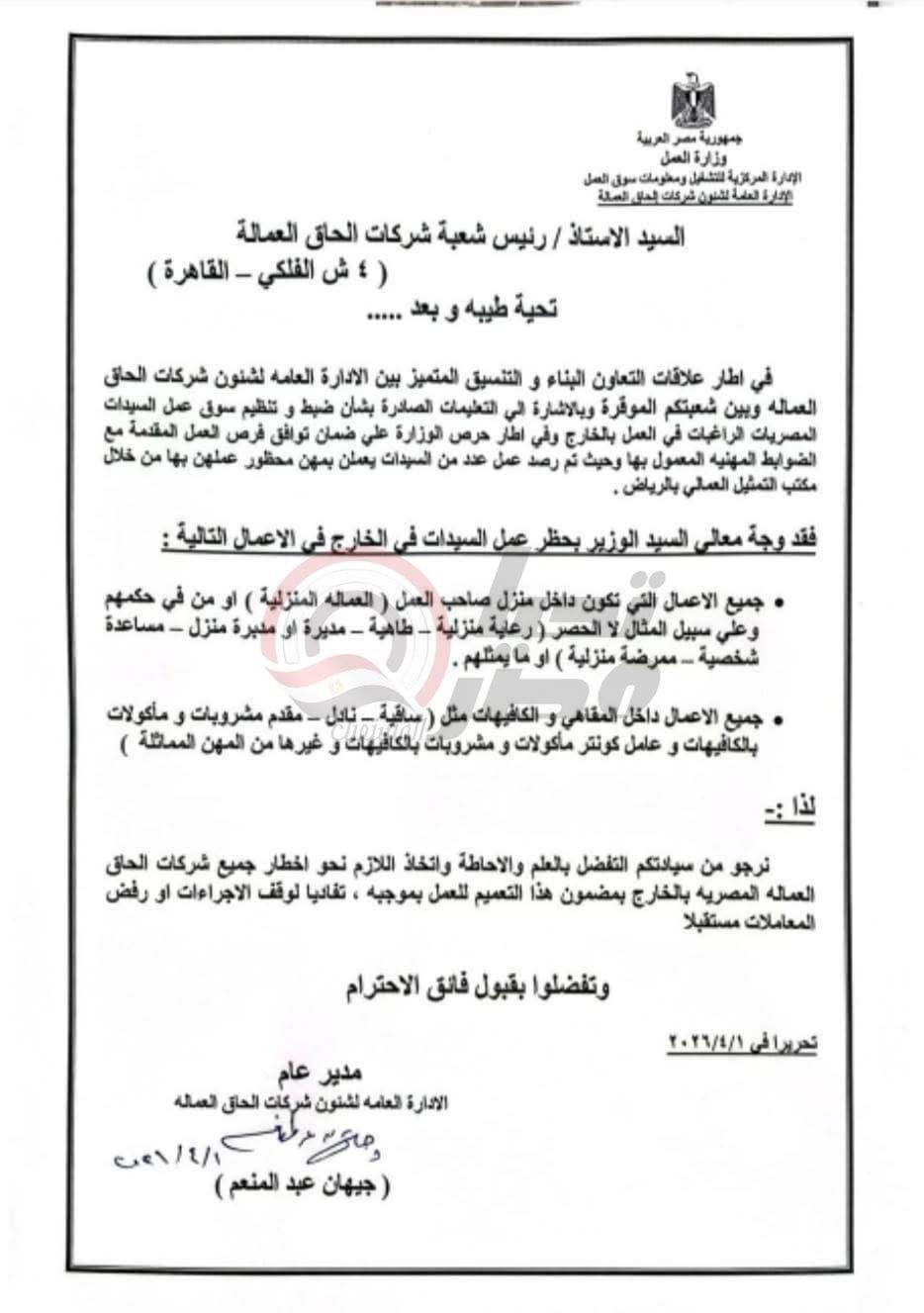 وجه حسن رداد وزير العمل شركات إلحاق العمالة المصرية في الخارج بحظر عمل السيدات في عدد من المجالات خارج البلاد، ومن أهم هذه الوظاف، العمل في الكافيهات والمهن داخل المنازل والرعاية المنزلية والطاهية ومديرة المنزل والمقاهي.