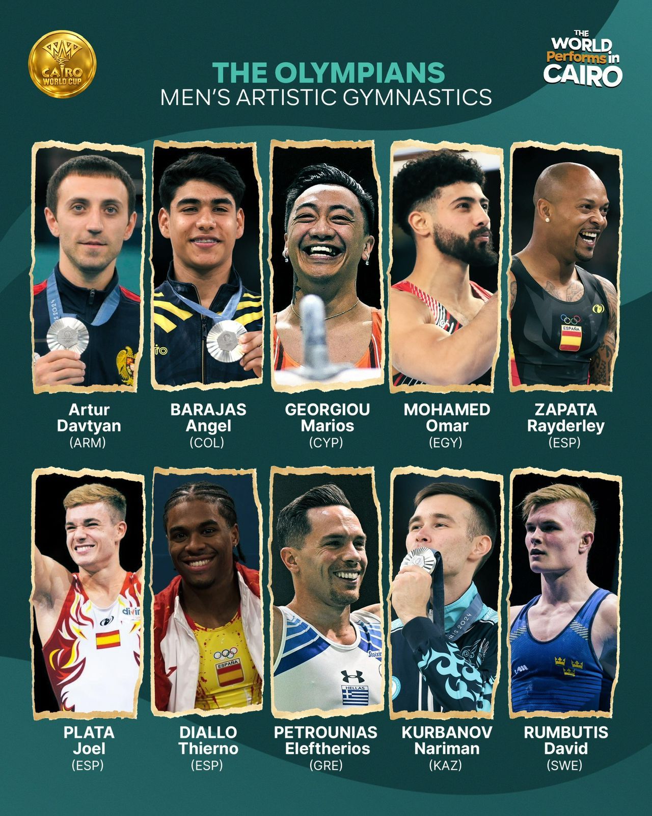 ويأتي على رأس المشاركين جني محمود البطلة الأولمبية من مصر، والجزائرية كيليا نمور صاحبة أول ميدالية ذهبية للعرب في أولمبياد باريس 2024، إلى جانب عمر العربي البطل الأولمبي المصري، والإسباني رايدرلي زاباتا الذي حقق الميدالية الفضية في أولمبياد طوكيو 2020.