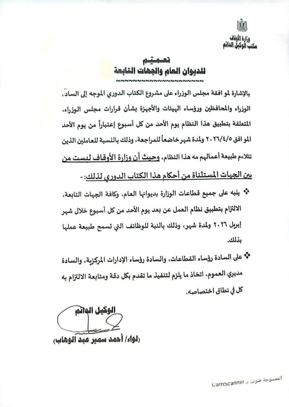 أصدرت وزارة الأوقاف، تنبيهًا رسميًا موجّهًا إلى الديوان العام والجهات التابعة، بشأن تطبيق نظام العمل عن بُعد يوم الأحد من كل أسبوع، وذلك تنفيذًا لقرارات مجلس الوزراء.