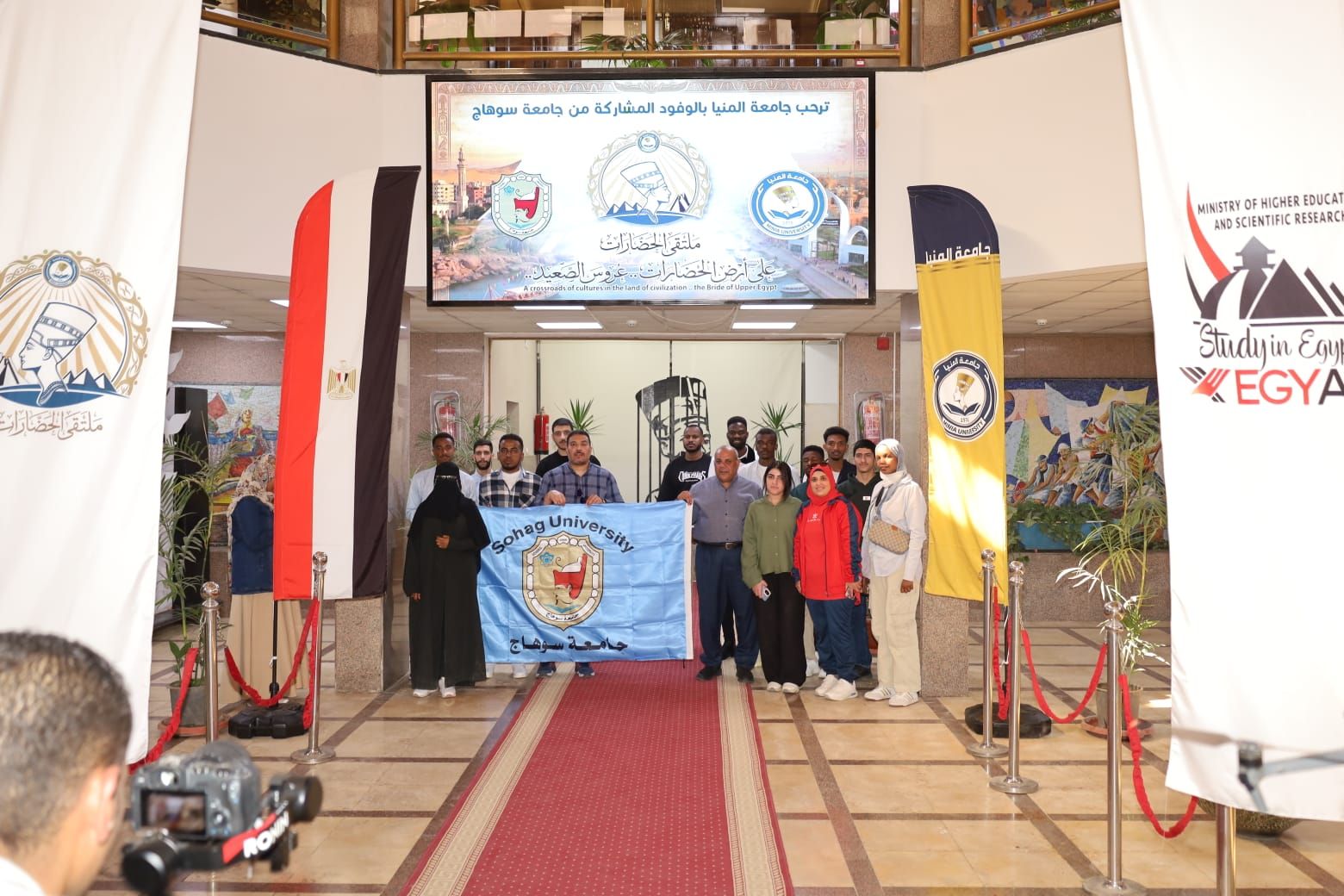 استقبلت جامعة المنيا برئاسة الدكتور عصام الدين صادق فرحات، رئيس الجامعة، وفود الجامعات المصرية الحكومية والأهلية والخاصة، من الطلاب الوافدين الأجانب المشاركين في فعاليات “ملتقى الحضارات على أرض الحضارات .. عروس الصعيد”، وذلك من أمام مبنى رئاسة الجامعة بالحرم الجامعي، وسط أجواء احتفالية متميزة.