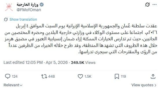 هذا فيما أعلنت وزارة الخارجية العُمانية، في بيان لها اليوم الأحد، أن عُمان وإيران عقدتا محادثات على مستوى نواب وزراء الخارجية لبحث خيارات ضمان انسيابية حركة السفن عبر مضيق هرمز، وفقًا لما نشرته وزارة الخارجية العمانية عبر منصة إكس.