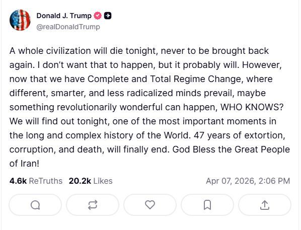 "حضارة كاملة ستموت الليلة" هكذا كتب الرئيس الأمريكي دونالد ترامب منشور له عبر منصة تروث سوشيال موجه رسالة تحذير أخيرة إلى إيران قبل فوات الآوان، ويأتي ذلك في ظل عدم وجود مؤشرات إيجابية حول التوصل إلى اتفاق لوقف الحرب التى جرت في المنطقة ليست طرفاً فيه بلا أجبرت على هذه المعركة المحفوفة بالمخاطر وأحدثت هزة في الاقتصاد العالمي وطالت الدول ذات الاقتصاد القوى قبل الدول التى تعاني من هشاشة اقتصادية.