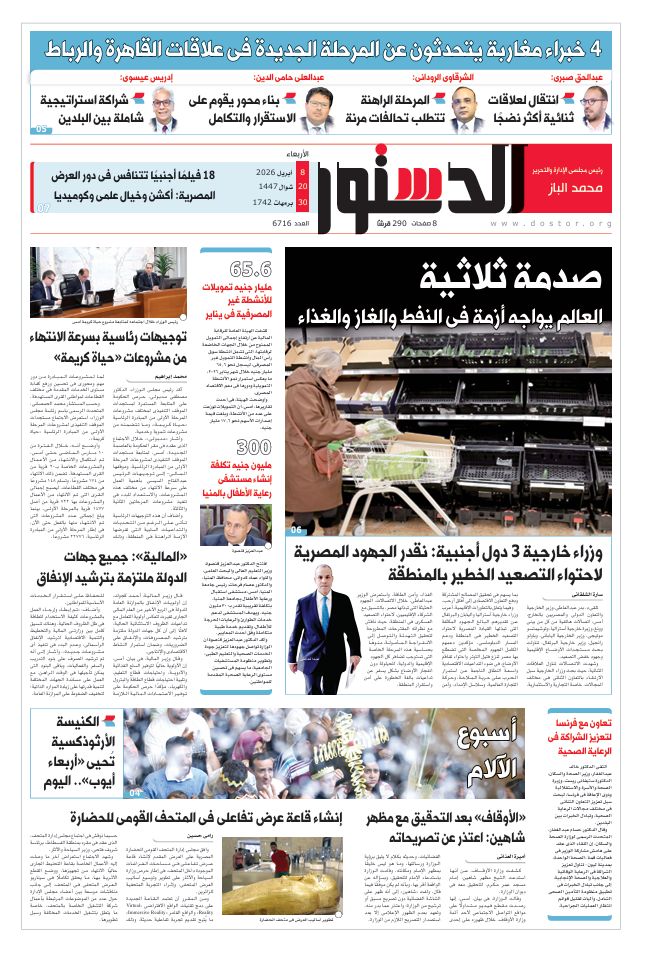 تنشر جريدة «الدستور» في عددها الصادر غدًا الأربعاء باقة من أبرز الملفات والتحقيقات التي ترصد ملامح المشهدين المحلي والدولي، في ظل تصاعد التحديات الاقتصادية عالميًا، وتزايد الضغوط السياسية في المنطقة، إلى جانب متابعة دقيقة لجهود الدولة المصرية في احتواء الأزمات وتعزيز الاستقرار داخليًا وخارجيًا.