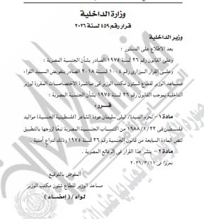 وأصدر وزير الداخلية محمود توفيق القرار رقم 459 لسنة 2026، بحرمان السيدة الفلسطينية ليلى سليمان عودة الشاعر، مواليد 22 يناير 1988، من اكتساب الجنسية المصرية تبعا لزوجها، وفقا لأحكام قانون الجنسية رقم 26 لسنة 1975، وذلك لدواعٍ أمنية.