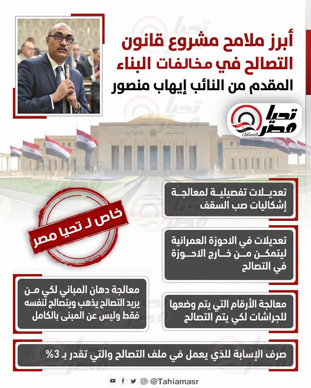 وأوضح منصور، في تصريحات خاصة لموقع تحيا مصر، أن مشروع القانون يتضمن عددًا من النقاط، وهي على النحو التالي:
