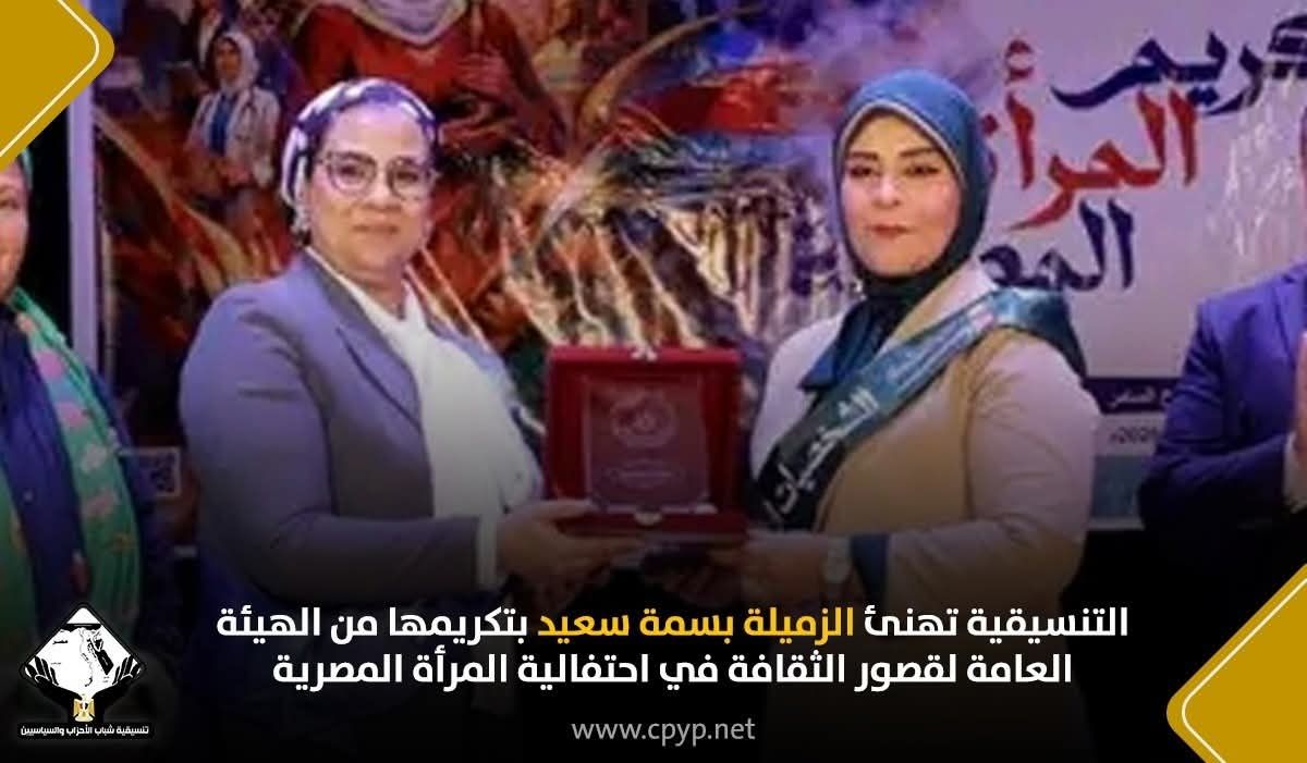 تقدمت تنسيقية شباب الأحزاب والسياسيين بخالص التهنئة إلى د. بسمة سعيد، بمناسبة تكريمها خلال احتفالية الهيئة العامة لقصور الثقافة بالمرأة المصرية، والتي أُقيمت تحت رعاية الدكتورة جيهان زكي وزيرة الثقافة.
