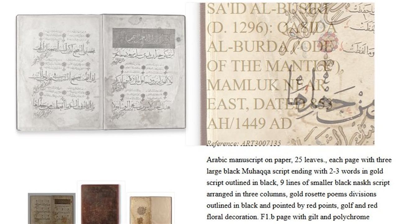 وبحسب موقع Oriental Art Auctions، وهو موقع متخصص في بيع المخطوطات والتحف الإسلامية والشرقية؛ فان مخطوط قصيدة "البُردة" للإمام محمد بن سعيد البوصيري، ويفتح المزاد  120 ألف يورو.