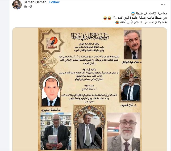 أما الباحث حسام الحداد فكتب معلقا: يا راجل ده إحنا في 2026 ولسه عاملين "كمين" فكري تحت رعاية نقابة الكتاب عشان يواجهوا الإلحاد في طنطا؟ يعني جايبين فيزياء نووية على فلسفة على مفكرين إسلاميين عشان يحاصروا "فكرة" في دماغ واحد، وكأن حرية الاعتقاد دي وباء محتاجين حملة تطعيم ضده قدام فرع جامعة الأزهر! البوستر لوحده يحسسك إننا داخلين غزوة مش ندوة علمية، وناقص بس يوزعوا خوذ وسيوف على الباب بدل الورق والقلم، في مشهد بائس بيأكد إن "حرية التعبير" لسه عندنا محتاجة واسطة عشان تعدي من كمين "الوصاية" اللي نصبه السادة المفكرين دول.