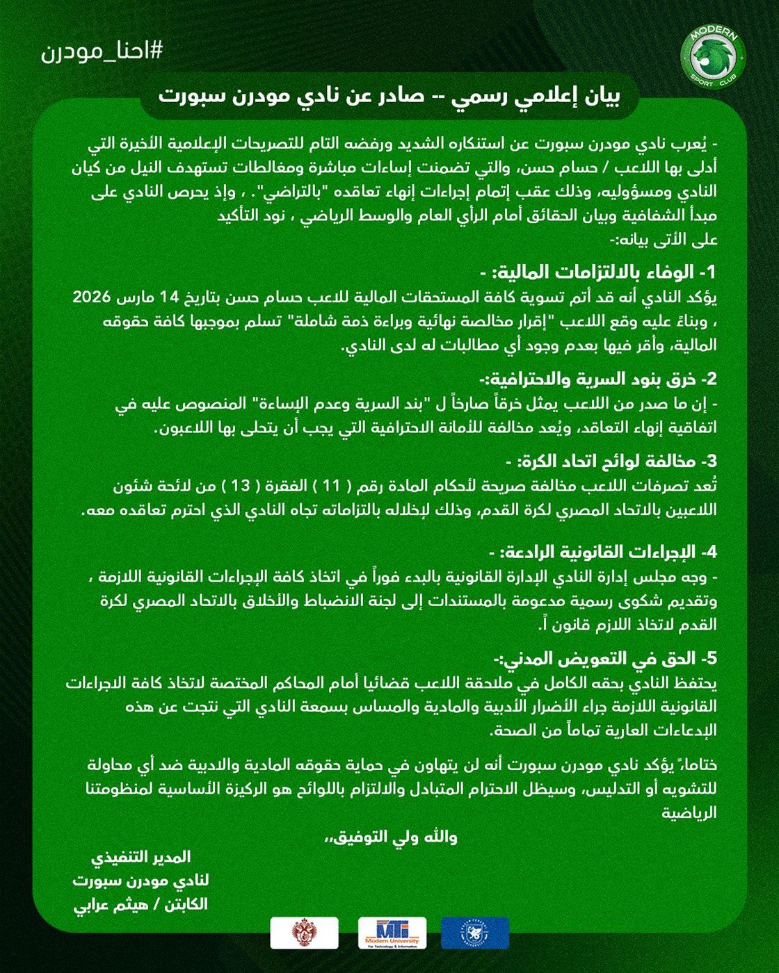 "يُعرب نادي مودرن سبورت عن استنكاره الشديد ورفضه التام للتصريحات الإعلامية الأخيرة التي أدلى بها اللاعب حسام حسن، والتي تضمنت إساءات مباشرة ومغالطات تستهدف النيل من كيان النادي ومسئوليه، وذلك عقب إتمام إجراءات إنهاء تعاقده "بالتراضي"، وإذ يحرص النادي على مبدأ الشفافية وبيان الحقائق أمام الرأي العام والوسط الرياضي، نود التأكيدعلى الأتى بيانه: