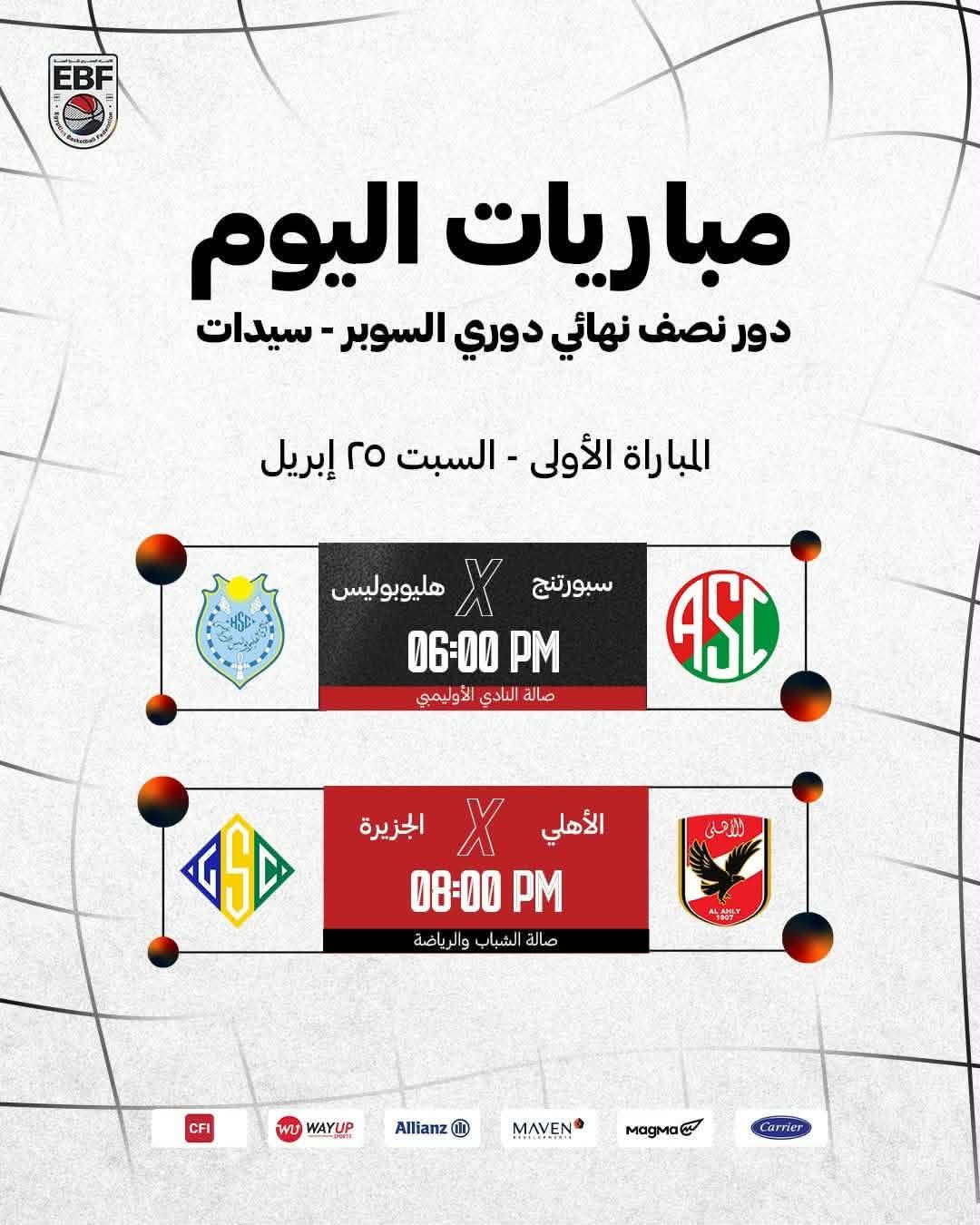 ومن المقرر أن يلتقي فريق سبورتنج نظيره هليوبوليس في تمام الساعة السادسة مساءً على صالة النادي الأولمبي، بينما يواجه الأهلي فريق الجزيرة في الثامنة مساءً على صالة الشباب والرياضة.