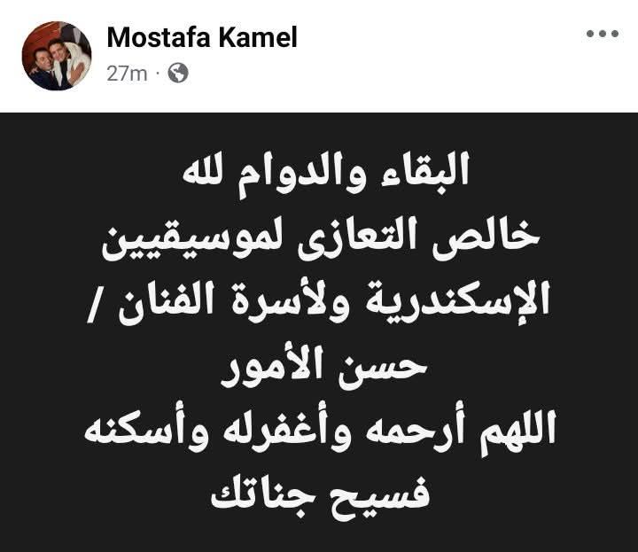 وكتب مصطفى كامل في منشور رصده موقع تحيا مصر منذ دقائق قليلة: "البقاء والدوام لله، خالص التعازى لموسيقيين الإسكندرية ولأسرة الفنان حسن الأمور، اللهم أرحمه وأغفرله وأسكنه فسيح جناتك".