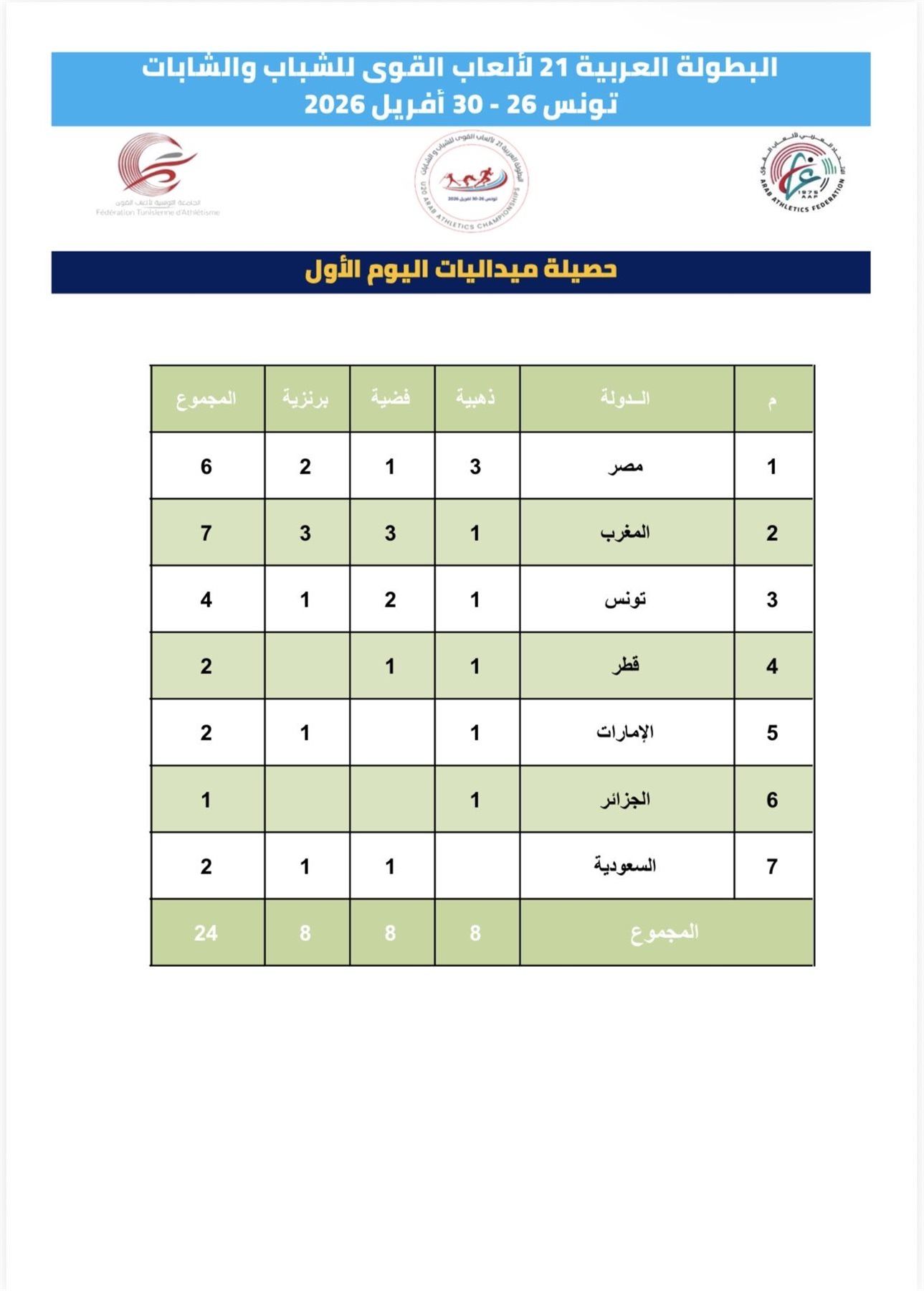 وبفضل هذه النتائج، تصدر منتخب مصر ألعاب القوى جدول ترتيب البطولة برصيد 6 ميداليات، متفوقا على المغرب التي جاءت في المركز الثاني برصيد 7 ميداليات منها ذهبية واحدة، فيما حلت تونس في المركز الثالث برصيد 4 ميداليات.