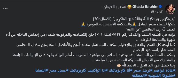 قضت المحكمة الاقتصادية ببراءة الفنانة غادة إبراهيم من تهمة سب وقذف الإعلامية بوسي شلبي في القضية التي حملت رقم 5569 لسنة 2026 جنح اقتصادية.