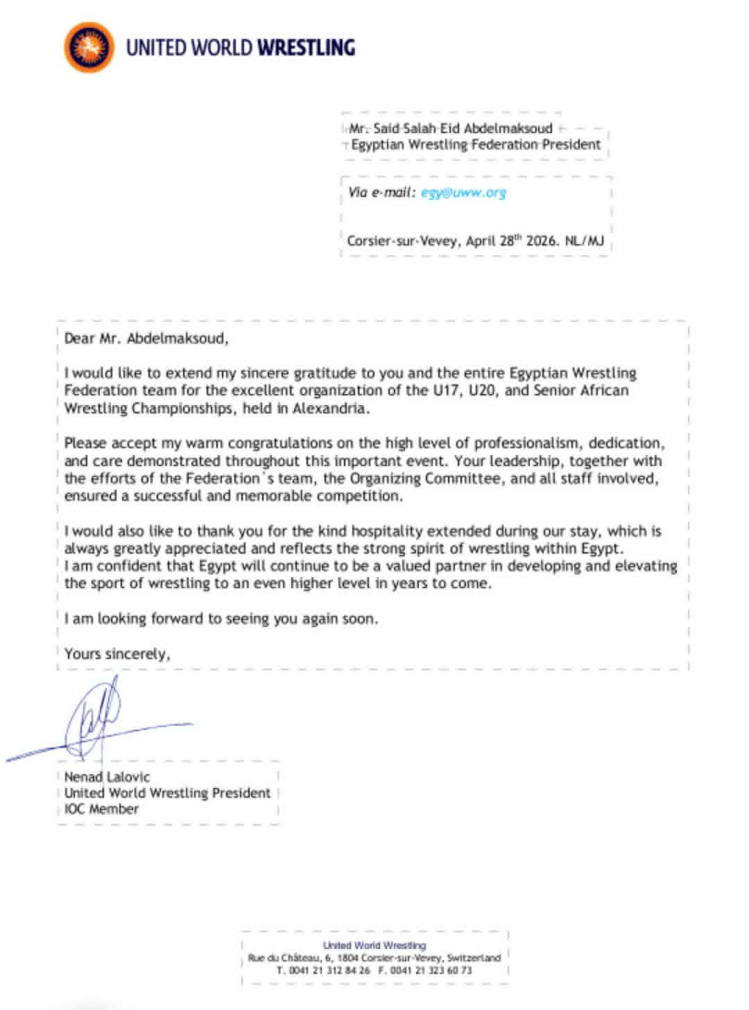 وجه الاتحاد الدولي للمصارعة برئاسة نيناد لالوفيتش رئيس الاتحاد الدولي وعضو اللجنة الأولمبية الدولية، خطابًا رسميًا إلى الاتحاد المصري للمصارعة برئاسة العميد سعيد صلاح، أعرب خلاله عن خالص تقديره وامتنانه لما شهده من تنظيم مميز لبطولة إفريقيا للمصارعة لفئات تحت 17 سنة، وتحت 20 سنة، والكبار، والتي تستضيفها مدينة الإسكندرية خلال الفترة من 25 أبريل وحتى 5 مايو المقبل.