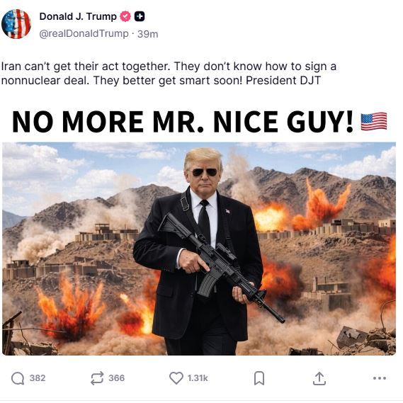 وارفق المنشور بصورة له أشبه بأفلام الهوليوود ويرتدي بدلة ونظارة سوداء ويحمل سلاحاً، وخلفه مشهد من الانفجارات فيما كتب على الصورة:" كفى. الرجل اللطيف".