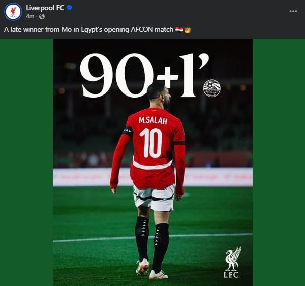 وسجل محمد صلاح هدف الفوز فى الدقيقة 91 من عمر المباراة التى كانت متجهة للتعادل، ليقود الفراعنة لأول فوز ويسجل الفرعون أول أهدافه فى أمم أفريقيا 2025، وكتب ليفربول عبر حسابه على فيسبوك: "هدف متأخر من محمد صلاح فى مباراة منتخب مصر الأولى فى كأس أمم أفريقيا" مع صورة لمحمد صلاح بقميص منتخب مصر.