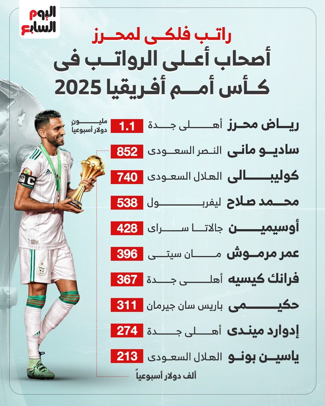 يحصل الجزائري رياض محرز على راتب أسبوعي يقدر بقيمة مليون و113 ألف دولار أسبوعياً وهو الأغلى بين لاعبي بطولة كأس أمم أفريقيا 2025.