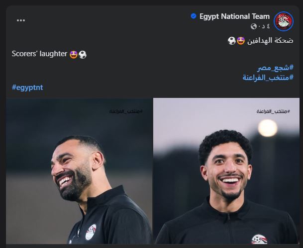 وعلقت صفحة المنتخب على صورة الثنائى صلاح ومرموش:" ضحكة الهدافين " ..socorers laughter .
