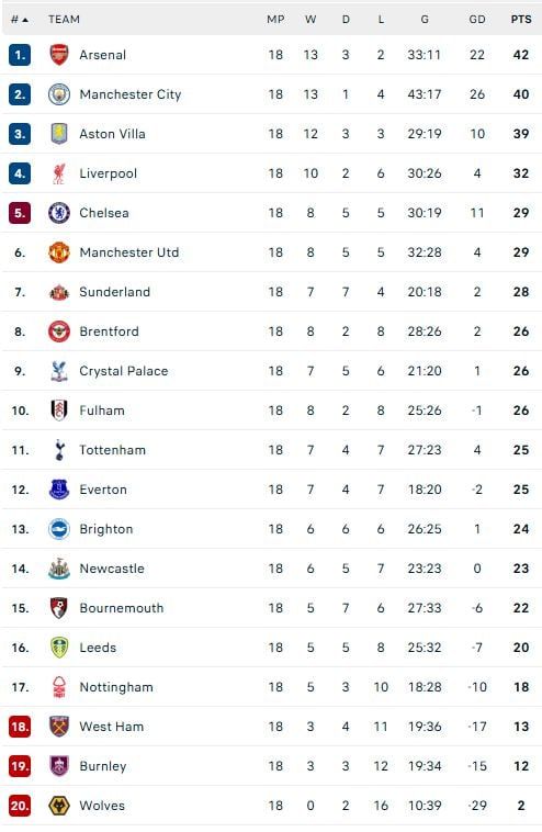 يحتل أرسنال صدارة ترتيب الدوري الإنجليزي برصيد 42 نقطة، بفارق نقطتين فقط عن أقرب منافسيه مانشستر سيتي.