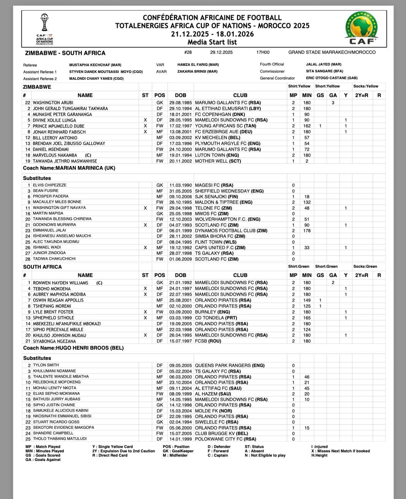 أعلن الجهازان الفنيان لمنتخبي زيمبابوي وجنوب أفريقيا تشكيلى المنتخبين استعدادًا لمواجهة التي جمعتهما على ملعب مراكش، ضمن منافسات الجولة الثالثة والأخيرة من دور المجموعات ببطولة كأس أمم أفريقيا 2025، المقامة حاليًا في المغرب، وتستمر حتى 18 يناير المقبل.