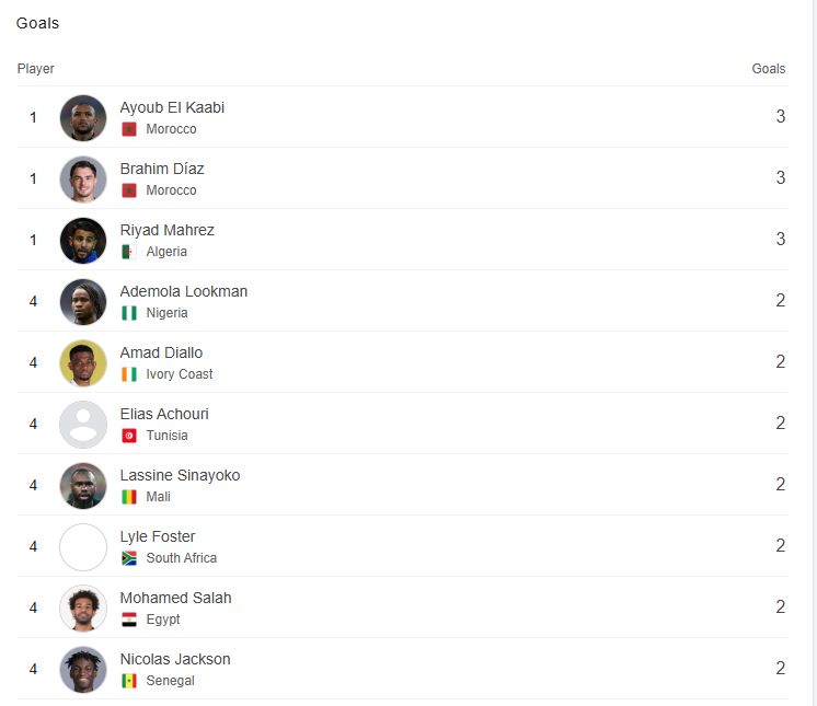 ويتصدر الثلاثي أيوب الكعبي وإبراهيم دياز ثنائي منتخب المغرب قائمة هدافي كأس أمم أفريقيا 2025 برصيد 3 أهداف، بالتساوي مع رياض محرز قائد منتخب الجزائر.ويتواجد محمد صلاح قائد منتخب مصر ضمن قائمة الهدافين برصيد هدفين سجلهما في شباك زيمبابوي وجنوب أفريقيا، متساويًا مع نيكولاس جاكسون (السنغال)، إلياس العاشوري (تونس)، لاسين سينايوكو (مالي)، اديمولا لوكمان (نيجيريا)، أماد ديالو (كوت ديفوار)، لايل فوستر، أوسوين أبوليس (جنوب أفريقيا).وبرصيد وهدف وحيد تواجد كل من في قائمة الهدافين، باتسون داكا (زامبيا)، تشيبانغ موريمي (جنوب أفريقيا)، شو، جيلسون دالا (أنجولا)، برينس دوبي، نوليدج موسونا، تاواندا ماسوانهيزي (زيمبابوي)، عمر مرموش (مصر)، ثيو بونجوندا، سيدريك باكامبو (جمهورية الكونغو الديموقراطية)، شريف نداي، ساديو مانيه (السنغال)، سيمي أجايي، فيكتور أوسيمهن، ويلفريد نديندي (نيجيريا)، تشارلز مموومبوا، سايمون مسوفا (تنزانيا)، إلياس السخيري، منتصر الطالبي، علي العابدي (تونس)، دينيس أوميدي، أوتشي إيكبيزو (أوغندا)، مارفن أنييبو (غينيا الاستوائية)، جورجي مينونغو، إدمون تابسوبا (بوركينا فاسو)، ابراهيم مازا (الجزائر)، كارل إيتا إيونج (الكاميرون)، يوهان روش (بنين)، فيصل بنجال، جيني كاتامو، ديوجو كاليلا (موزمبيق)، إيميريك أوباميانج، أليكس موكيتو-موسونداه (الجابون).
