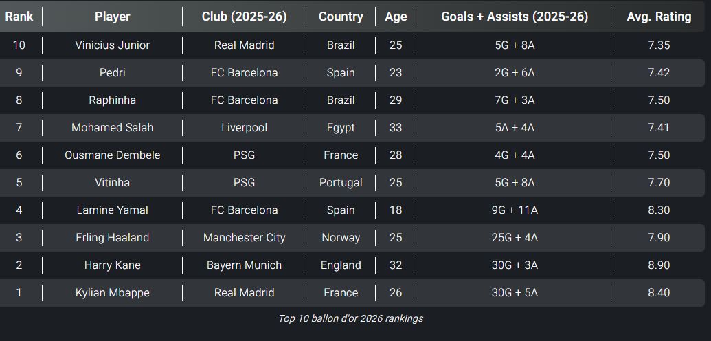 وتحولت الأنظار مبكرًا إلى سباق الكرة الذهبية لعام 2026، عقب تتويج عثمان ديمبيلي نجم منتخب فرنسا ونادي باريس سان جيرمان الفرنسي بالجائزة في نسخة 2025، حيث بدأت التصنيفات الأولية ترسم ملامح المنافسة المنتظرة، خاصة مع اقتراب نهائيات كأس العالم 2026 التي ستقام في الولايات المتحدة الأمريكية وكندا والمكسيك.، التي تُعد عاملًا حاسمًا في تحديد هوية الفائز.