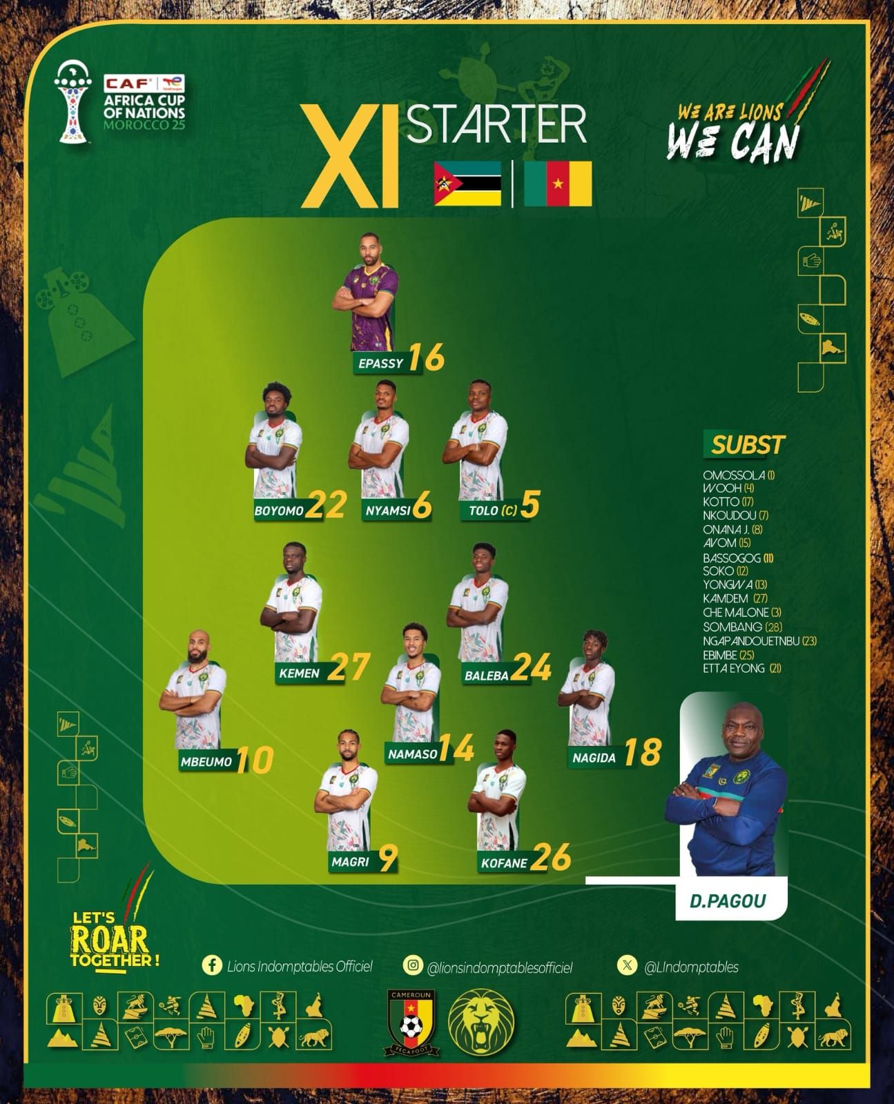أعلن ريجوبير سونج، المدير الفني لمنتخب الكاميرون، التشكيل الرسمي لـ«الأسود غير المروّضة» استعدادًا لمواجهة موزمبيق، المقرر إقامتها في التاسعة مساء اليوم على ملعب «أغادير»، ضمن منافسات الجولة الثالثة والأخيرة من دور المجموعات ببطولة كأس أمم أفريقيا 2025 المقامة حاليًا في المغرب.