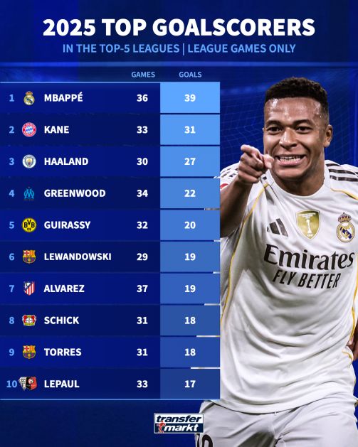 وقال موقع ترانسفير ماركت، أن الفرنسي كيليان مبابي لاعب ريال مدريد يتصدر قائمة هدافي الدوريات الكبرى برصيد 39 هدفا في 26 مباراة.وأضاف الموقع، أن مبابي تصدر القائمة التي تضم 20 لاعبا بعد بداية متواضعة نسبياً لمسيرته مع لوس بلانكوس، ولكن وفقاً لمعاييره العالية، تمكن الفرنسي من تسجيل 39 هدفاً مذهلاً في 26 مباراة بالدوري الإسباني خلال عام 2025، وجاء الإنجليزي هاري كين لاعب بايرن ميونخ في المركز الثاني مواصلا تألقه بتسجيله 31 هدفاً في 33 مباراة بالدوري الألماني.