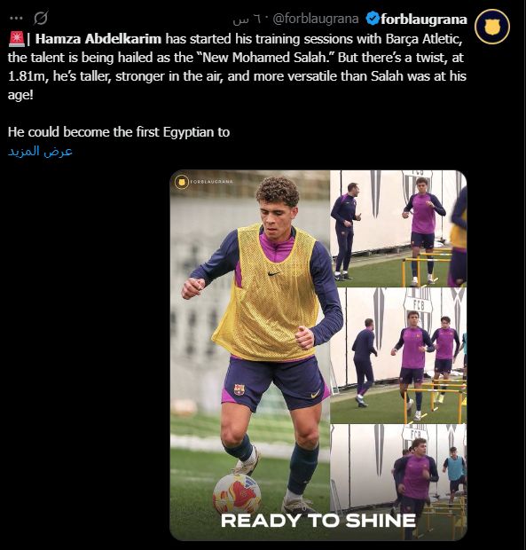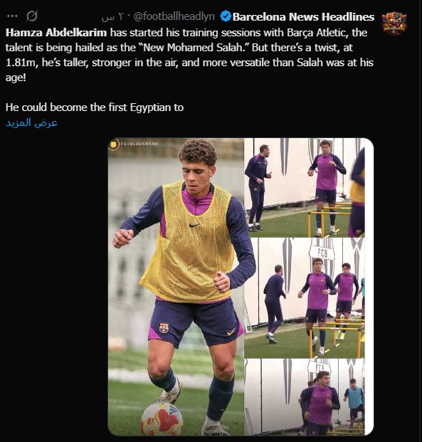وفي السياق ذاته، أكدت صفحة forblaugrana أن حمزة عبد الكريم بدأ تدريباته مع برشلونة أتلتيك وسط إشادة فنية كبيرة، معتبرة أن تفوقه البدني وقدرته على اللعب بأكثر من مركز هجومي يمنحانه أفضلية مقارنة بما كان عليه محمد صلاح في نفس المرحلة العمرية.