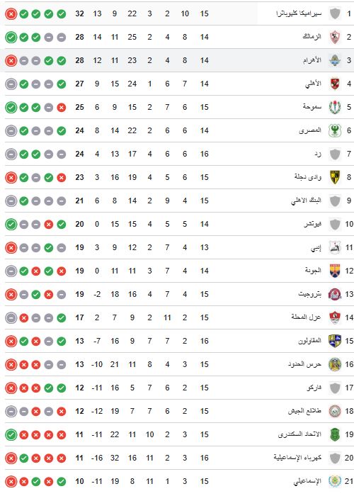 يواصل فريق سيراميكا صدارة ترتيب الدوري الممتاز برصيد 32 نقطة، متفوقا على الزمالك صاحب الوصافة بـ4 نقاط، وذلك قبل مباريات اليوم الخميس، في بطولة الدورى.