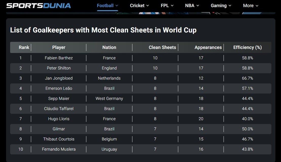 بحسب التقرير، تأتي قائمة أفضل 10 حراس مرمى حققوا أكبر عدد من الشباك النظيفة في تاريخ كأس العالم كالتالي: