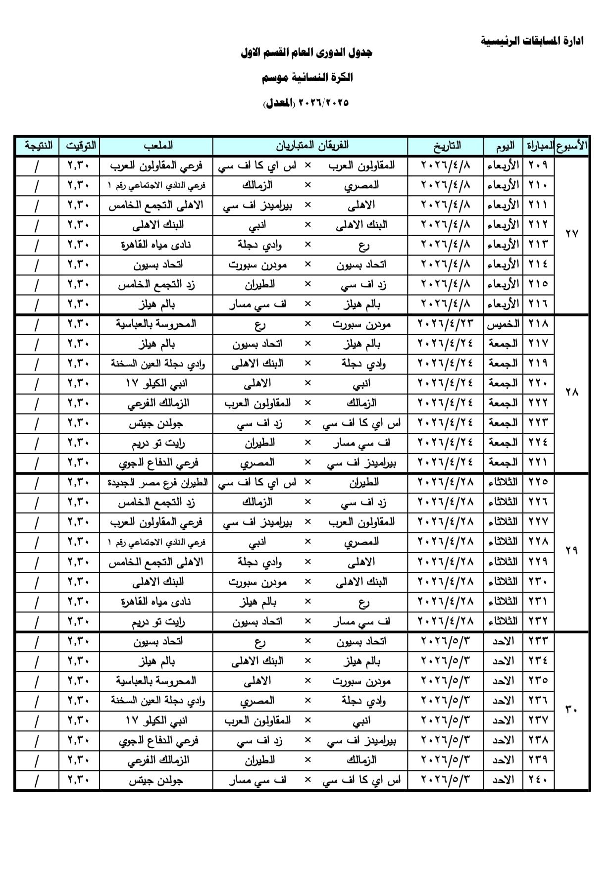 وأخطرت إدارة المسابقات الأندية المشاركة في المسابقة بالجدول الجديد، على أن تُطبق التعديلات اعتبارًا من الأسبوع الـ27 وحتى الأسبوع الـ31 من عمر المسابقة، مع الالتزام الكامل بالمواعيد المحددة.
