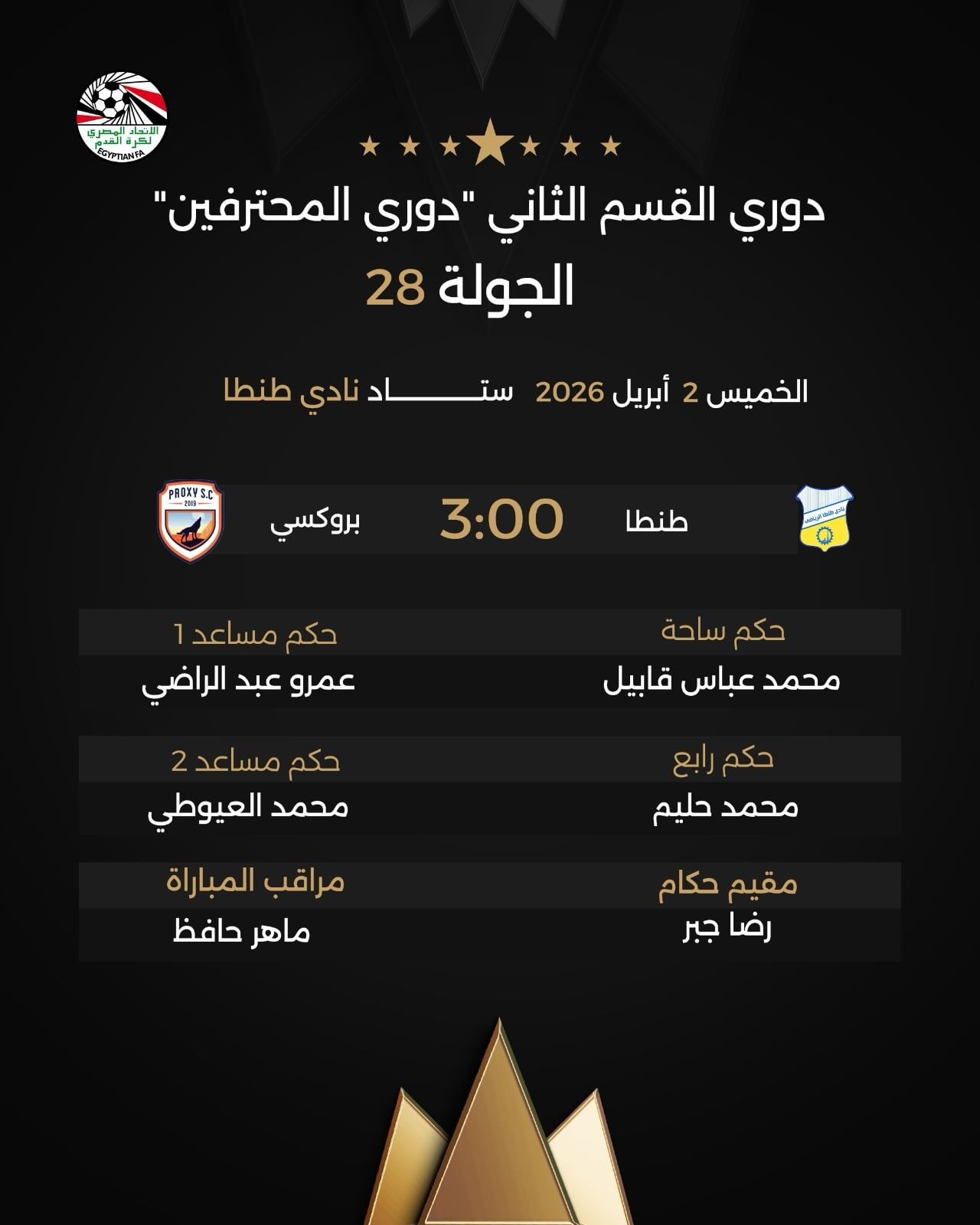 بينما يدير محمد عباس قابيل مباراة طنطا وبروكسى المقرر إقامتها بإستاد طنطا الرياضة في لقاء لا يقبل القسمة على اثنين خاصة لأصحاب الأرض الذين يحتلون المركز الرابع عشر برصيد 24 نقطة ، بينما يحتل الضيوف المركز السادس برصيد 35 نقطة .