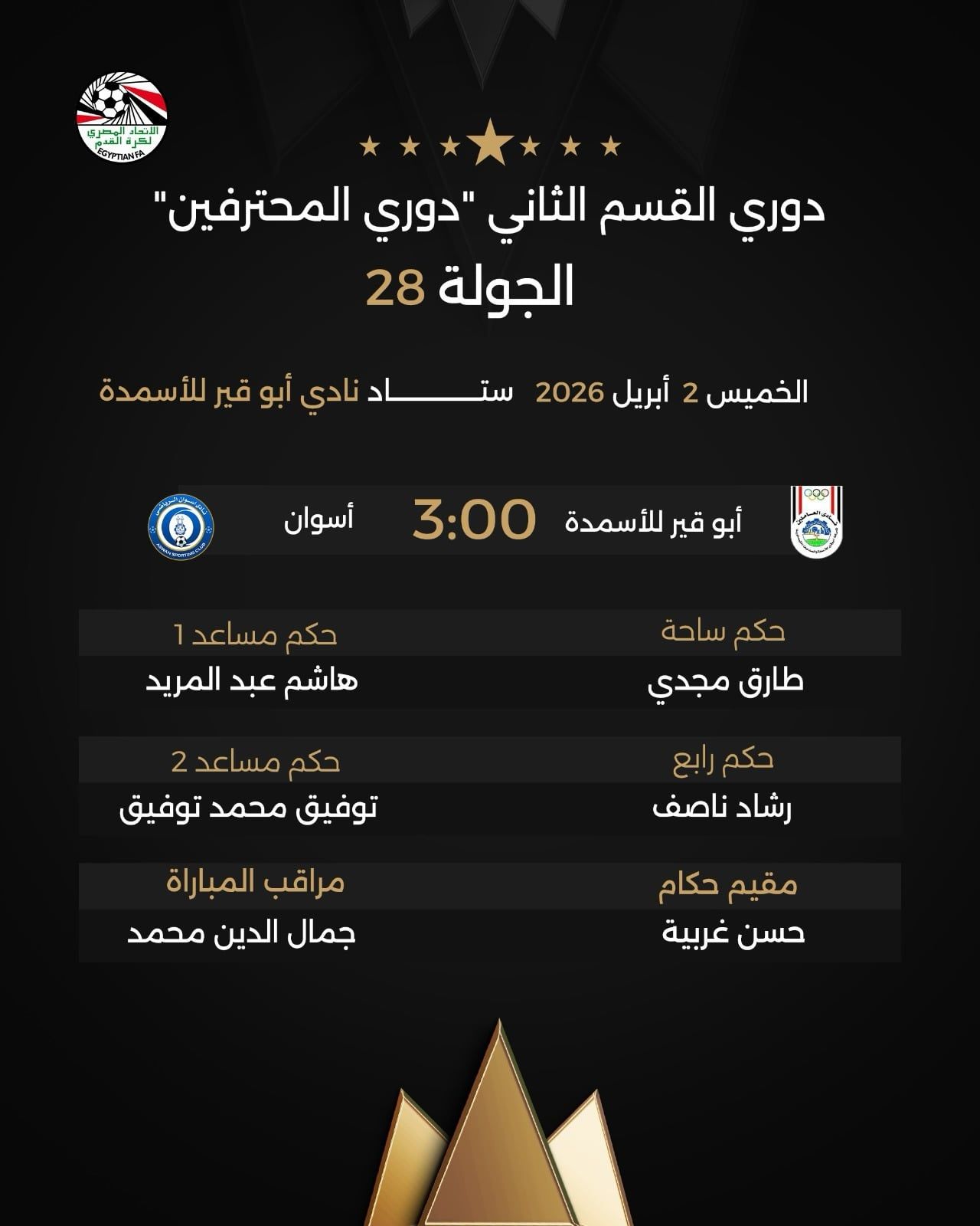 يدير طارق مجدى مباراة أبو قير للأسمدة وأسوان المقرر إقامتها بالإسكندرية بعد المطالبات العديدة التي أقامها مسئولو أبو قير للأسمدة ، ويسعى أمير عزمى مجاهد لمواصلة الإنتصارات بعد الفوز الذى حققه الفريق فى مباراته الماضية خارج ملعبه على مالية كفر الزيات بهدف مقابل للاشئ .
