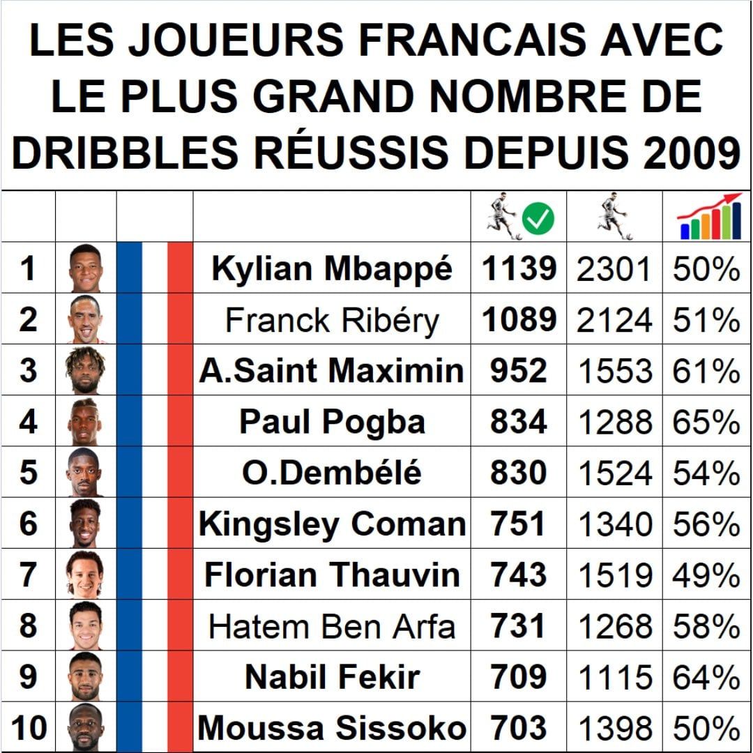 وفي المراكز التالية، حل بول بوجبا في المرتبة الرابعة برصيد 834 مراوغة ناجحة، يليه عثمان ديمبيلي نجم باريس سان جيرمان في المركز الخامس بـ 830 مراوغة، ليواصل حضوره ضمن نخبة اللاعبين الأكثر مهارة في الكرة الفرنسية خلال السنوات الأخيرة، وتعكس هذه الأرقام التفوق الفني الكبير للاعبين الفرنسيين، وقدرتهم على صناعة الفارق بالمهارة الفردية، في مختلف البطولات الأوروبية منذ أكثر من عقد.