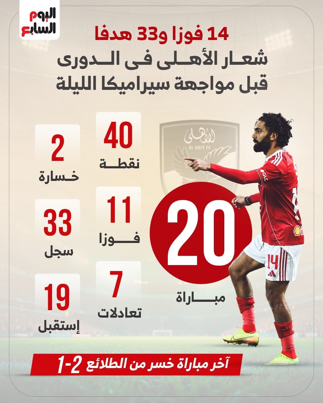 يستعد الأهلى لمواجهة سيراميكا فى الثامنة مساء اليوم الثلاثاء باستاد المقاولون العرب ضمن منافسات الجولة الأولى من مرحلة التتويج بدوري نايل.
