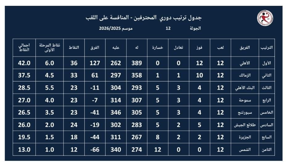 حسم فريق رجال كرة اليد بالنادي الأهلى لقب دوري المحترفين للموسم المحلي 2025-2026 بالفوز على سبورتنج بنتيجة 43-23 فى الجولة الثانية عشرة من المرحلة الثانية.