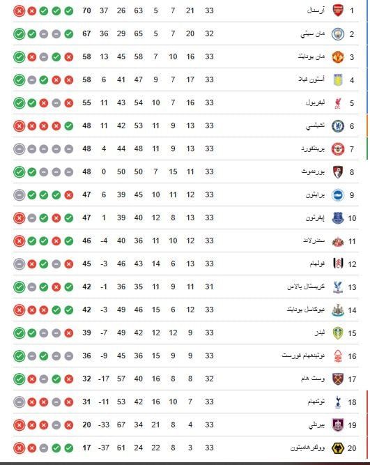 بهذه النتيجة قلص مانشستر سيتي الفارق إلى 3 نقاط فقط، حيث يتصدر أرسنال الترتيب برصيد 70 نقطة، فيما يحتل السيتي الوصافة برصيد 67 نقطة وله مباراة مؤجلة، إذ انتصر فيها سيعادل رصيد أرسنال من النقاط.