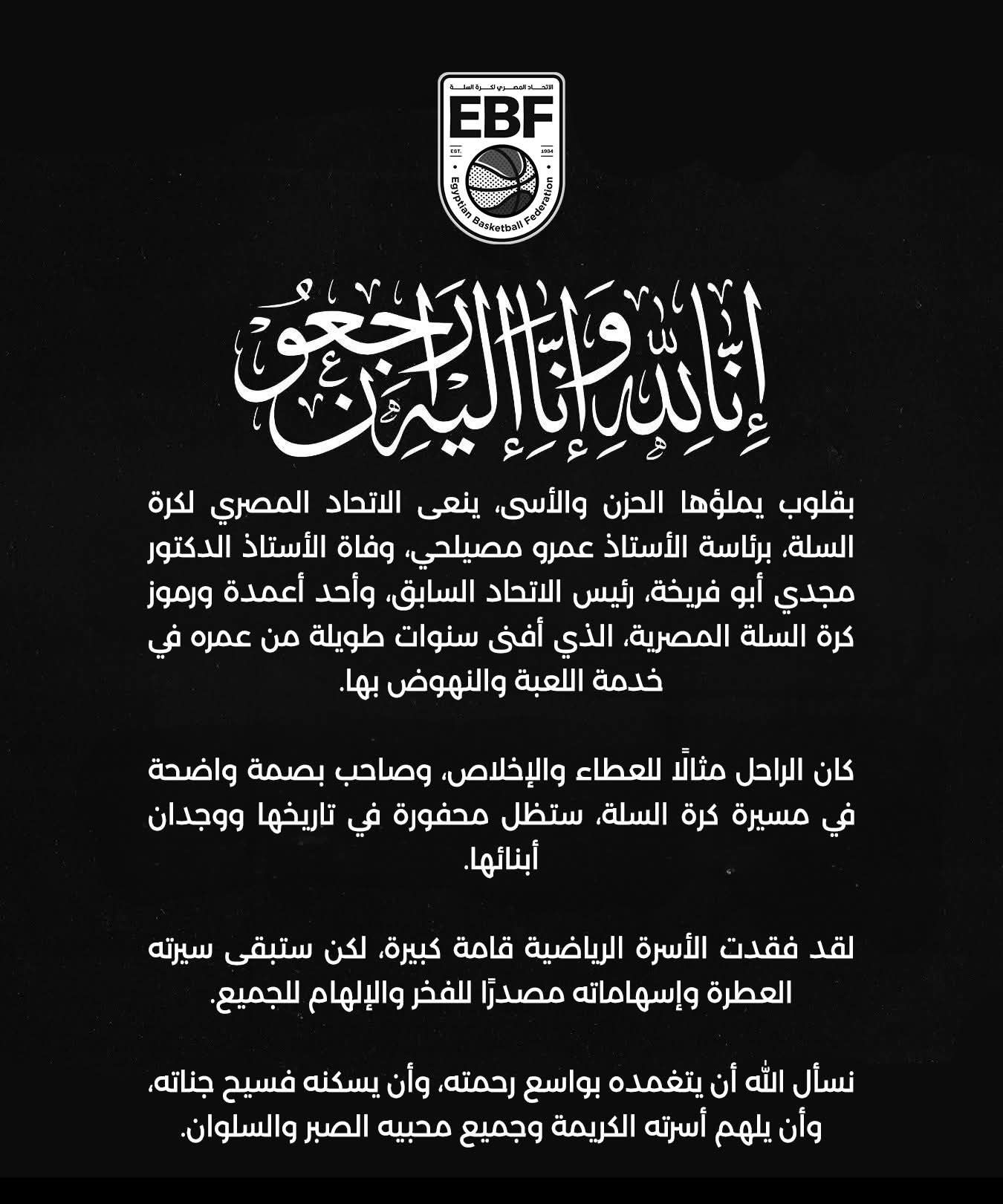 نعى اتحاد كرة السلة برئاسة عمرو مصيلحى، وفاة الدكتور مجدى أبو فريخة رئيس الاتحاد السابق، الذى توفى اليوم اثر أزمة قلبية مفاجأة.