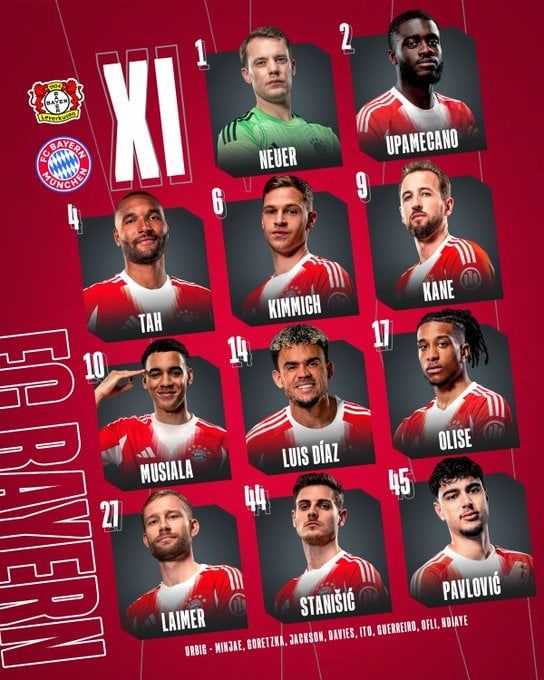 كشف فينسنت كومباني، المدير الفني لفريق بايرن ميونخ عن تشكيل مواجهة مضيفه فريق باير ليفركوزن، المقرر لها في تمام التاسعة إلا الربع من مساء اليوم الأربعاء، على ملعب «باي أرينا»، ضمن منافسات الدور نصف النهائي من بطولة كأس ألمانيا.